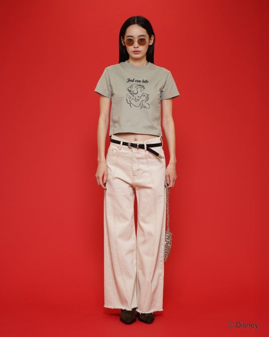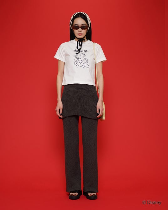 “Just one bite”のラインストーンが目を惹く、洗練されたプリントTシャツ。モノクロデザインで甘すぎず、コンパクトなシルエットと短め丈が女性らしさとトレンド感をプラス。ボトムとのバランスも取りやすく、レイヤードにも◎。キュッと詰まったネックラインと後ろのメタルプレートが、大人のこなれ感を引き立てます。