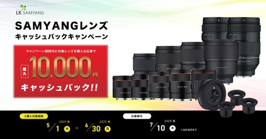 株式会社ケンコー・トキナー(本社:東京都中野区 代表取締役社長:山中 徹)は、2025年5月1日~6月30日の期間中に対象レンズをご購入の上、所定の応募用紙でご応募いただいたお客様に、最大10,000円を還元する「SAMYANGレンズキャッシュバックキャンペーン」を実施いたします。
