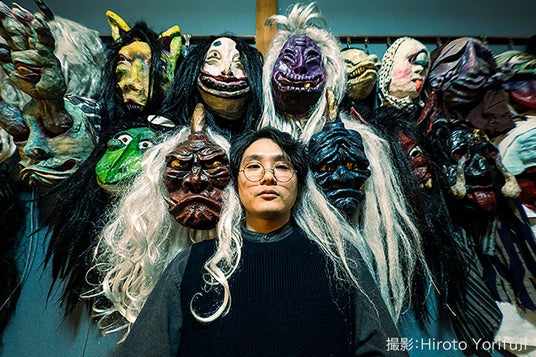 河野隼也さんと、河野さんが造形した妖怪お面たち 撮影:Hiroto Yorifuji
