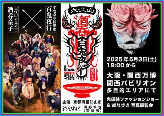 京都府福知山市は、2025年大阪・関西万博の関西パビリオン多目的エリアにおいて、5月3日に妖怪仮装行列「百鬼夜行」イベントを開催します。題して「大江山酒呑百鬼夜行(おおえやましゅてんひゃっきやぎょう)」。また、5月19日~25日には関西パビリオン京都ゾーンにて、本市の大江山に棲んでいたという鬼の王「酒呑童子」伝説に関する展示を行います。