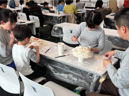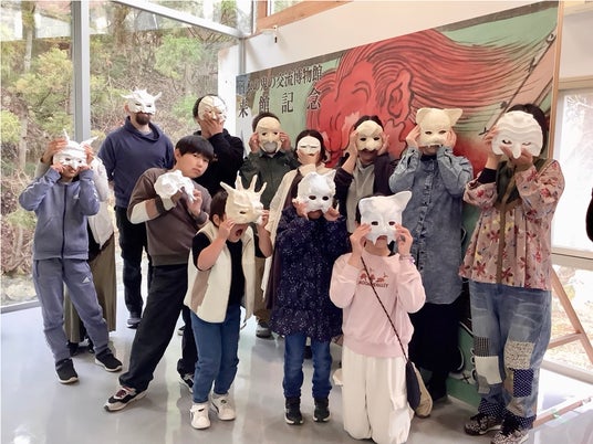 この万博出展に向けた特別企画として、福知山市内で3~4月にかけて「オリジナル鬼お面づくりワークショップ」を開催しました。市民や市にゆかりがある人が、百鬼夜行クリエイターの河野隼也さん指導のもと、本格的な鬼のお面を制作。「大江山酒呑百鬼夜行」にて着用し、鬼に扮して会場やその付近を練り歩きます。百鬼夜行の様子は、その後の京都ゾーンでも一部展示されます。さらに、2025年秋には「凱旋企画」として、日本の鬼の交流博物館で万博出展と連動した特別展の開催を予定しています。