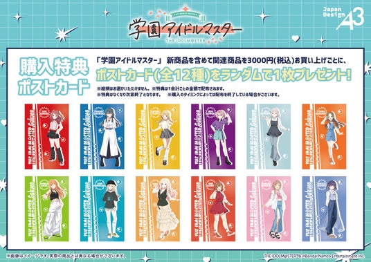 『学園アイドルマスター』POP UP SHOPにて新商品を含む関連商品を3,000円(税込)お買い上げごとに、購入特典としてポストカード(全12種)をランダムで1枚プレゼント。