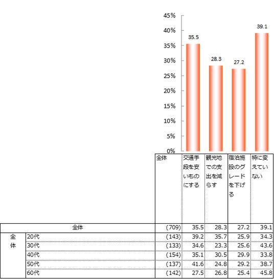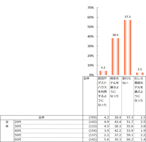 また、宿泊施設の選び方については「変わらない」が57.3%となり、次いで「格安ホテルを選ぶようになった」が38.4%だった。