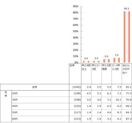 一方、海外旅行は「ほとんど行かない」が82.1%と突出している。年代別で見ても、全ての年代で7割以上を占めた。