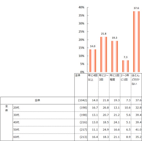 近年(過去3年間)における国内旅行の頻度は「ほとんど行かない」が37.6%だった。「年に4回以上」が14.0%、「年に2~3回」が21.8%、「年に1回程度」が19.3%となり、合わせると55.1%だった。過半数が年1回以上、国内旅行をしている。