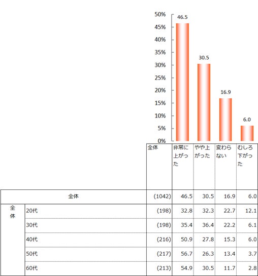 宿泊費・交通費などの「旅行費」について、以前と比べて上がったと感じるかを聴取したところ、「非常に上がった」が46.5%、「やや上がった」が30.5%となった。合わせると全体の約8割が高騰を実感している。