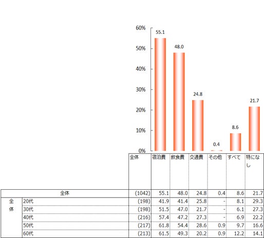 また、インバウンド需要の影響で価格が上がったと感じる旅行費の内訳は、「宿泊費」が全体の55.1%で過半数を占め、全ての年代でトップだった。次いで「飲食費」が全体の48.0%、「交通費」が24.8%となった。