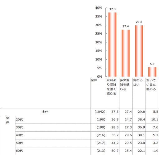 インバウンドの増加によって、観光地の混雑を感じるか伺ったところ、「以前より混雑を強く感じる」が全体の37.3%、「多少混雑を感じる」が27.4%となり、合わせると64.7%だった。