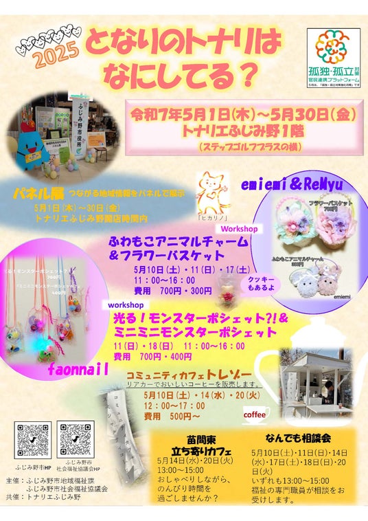 地域は「人」でできています。一人一人が輝き、人と人をつなげる仕組みや仕掛けを作りたいと「つながろうふじみ野プロジェクト2025」をテーマに、市内商業施設トナリエふじみ野との官民連携による孤独・孤立対策の啓発イベントを開催します。