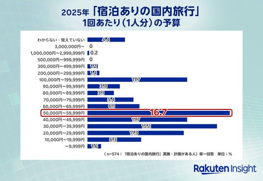 ・宿泊ありの国内旅行にかける予算は「50,000円~59,999円」、海外旅行の予算は「100,000円~199,999円」が最多