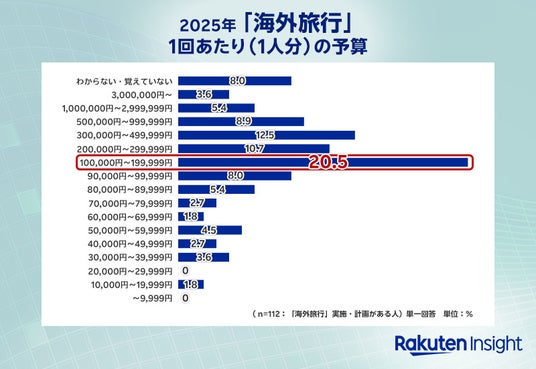 2025年の旅行について1回あたりの予算(1人分)を聞いたところ、「宿泊ありの国内旅行」では「50,000円~59,999円」(18.3%)が最も多く、次いで「30,000円~39,999円」(12.9%)、「100,000円~199,999円」(11.8%)が続いた。海外旅行では「100,000円~199,999円」(18.8%)が最も多く、次いで「200,000円~299,999円」(12.0%)と「300,000~499,999円」(12.0%)が続く結果となった。