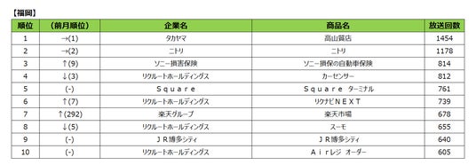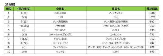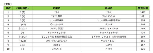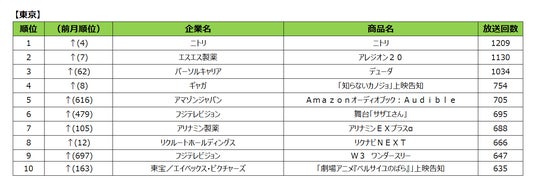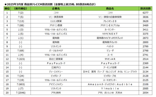 2025年3月度の全国テレビCM放送回数ランキングでは、ニトリが新生活需要を捉え首位を獲得。リクルートホールディングスは、春の就職・転職シーズンや引越しシーズンを背景に「カーセンサー」「リクナビNEXT」「スーモカウンター」が上位にランクインし、積極的なCM放映が際立ちます。