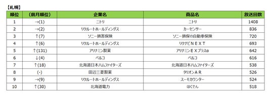 2025年3月度のエリア別テレビCM放送回数ランキングでは、ニトリが新生活需要を背景に多くのエリアで上位を占めました。同様に、引越しや新生活関連サービスを提供するリクルートホールディングス(カーセンサー、スーモ等)も各エリアで上位にランクイン。春の移動シーズンに合わせて、ソニー損害保険などの自動車保険のCMも目立ちます。花粉症シーズンであるため、アリナミンEXプラスαやアレジオン20といった医薬品のCMも広く放送されました。地域別に見ると、大阪では万博関連CM、札幌ではプロ野球チームのCMが見られるなど、地域ごとのイベントや特性も反映されています。