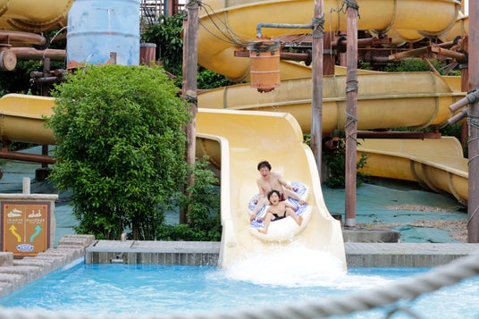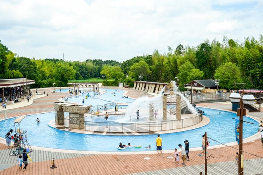 噴水火山を中心に、沢登りや渓流スライダー、滝のカーテンなど自然の地形を模した仕掛けが豊富なプールです。