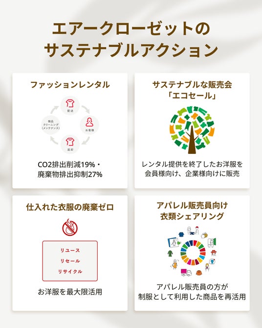 当社は、お洋服のサステナビリティ・循環型のサイクルを意味する“サーキュラーファッション”を推進しています。シェアリングモデルのファッションレンタルサービス『airCloset』では、CO2排出削減19%・廃棄物排出抑制27%の効果が推計※2されています。現在は、シェアリングモデルのファッションレンタルサービスの運営に加えて、レンタル提供を終了したお洋服を販売する「エコセール」、アパレル販売員の方が制服として利用した商品を再活用する「アパレル販売員向け衣服シェアリング」を行っています。さらに、自社で取り扱う全てのお洋服について、焼却・埋め立て処分しない衣服廃棄ゼロを実現しています。