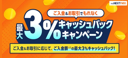 ご入金&『外貨ネクストネオ』でのお取引でもれなく最大3%キャッシュバックいたします!