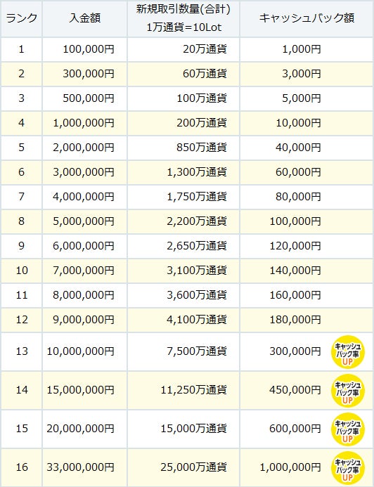 下表の通り入金額※1の最大3%をキャッシュバックいたします(上限1,000,000円)。