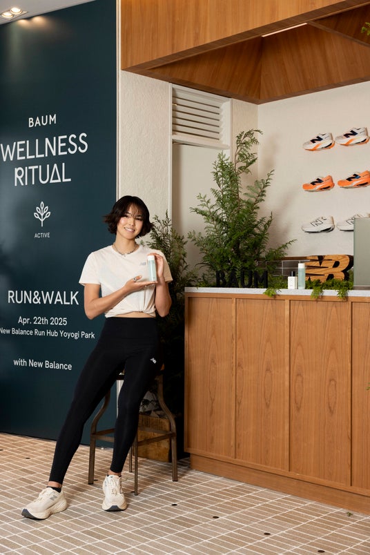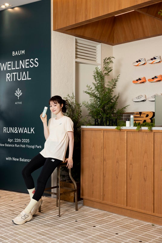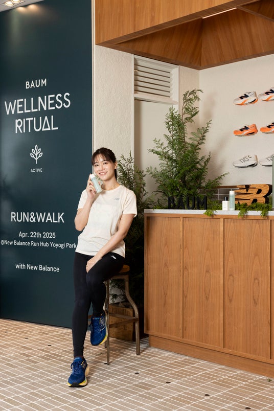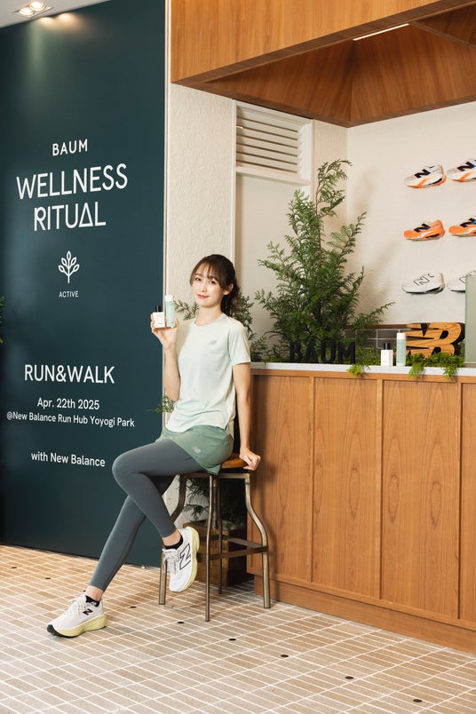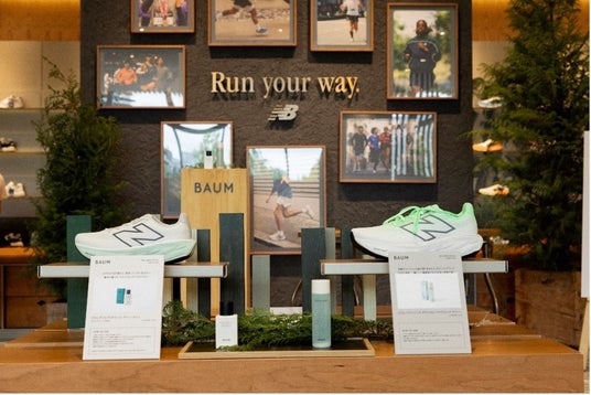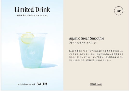 また、6月末までの期間、ニューバランスRun Hub代々木公園では、BAUM ウェルネスリチュアル(RUN & WALK)」で使用したナチュラルUVプロテクター「バウム ダブルプロテクション デイシールド n」とボディフレグランス「バウム リフレッシング ボディコロン アクアティック グリーン」をお試しいただけるとともに、店内のカフェでは「バウム リフレッシング ボディコロン アクアティック グリーン」にインスパイアされたオリジナルドリンク「Aquatic Green Smoothie(アクアティックグリーンスムージー)」が販売されています。