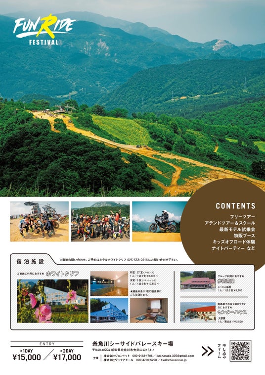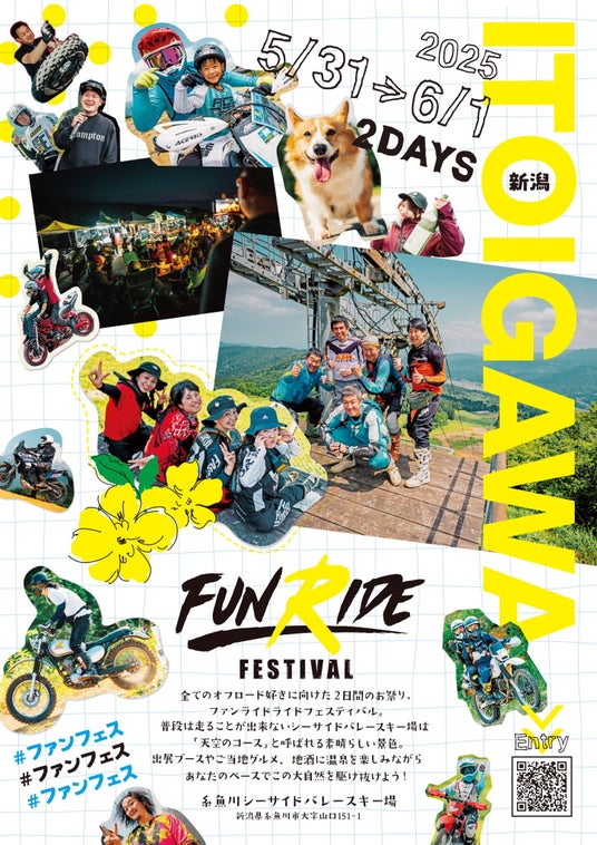 「FUN RIDE FESTIVAL」は、全国から延べ700名以上のオフロードバイクファンが集う、年に一度のアウトドアイベントです。会場となる新潟・糸魚川の根知谷にあるシーサイドバレースキー場は、普段は静けさに包まれた場所ですが、この2日間は“天空のコース”と呼ばれる絶景の中で、ライダーたちの熱気と笑顔に包まれます。