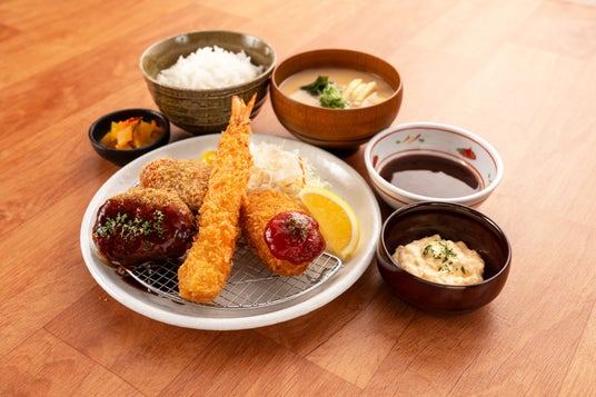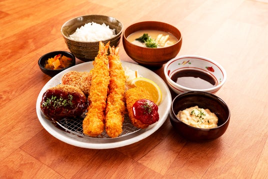 「ごちそうミックスフライ定食」は、食べ応えのある大ぶりな海老フライ・ジューシーなメンチカツ・とろ~りカニクリームコロッケなど、特別感あふれるおかずを盛り付けた食べ応え抜群の定食です。