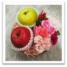 季節のフルーツとお花をバスケットに詰合せ、かわいらしくまとめました。お花はブーケ又はアレンジメントに変更が可能です。