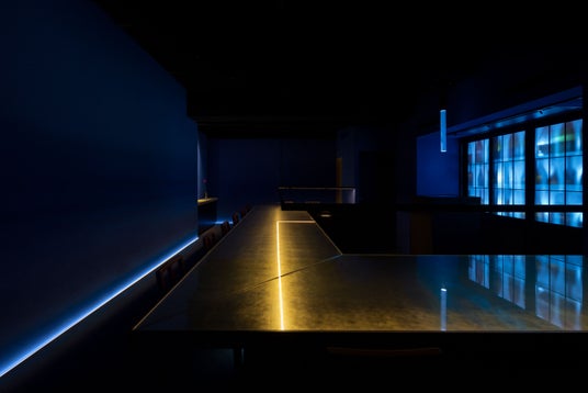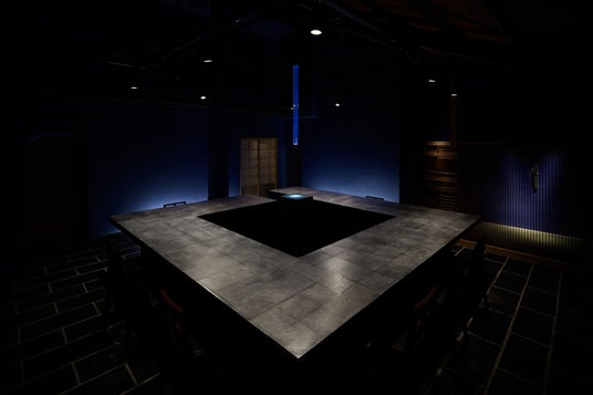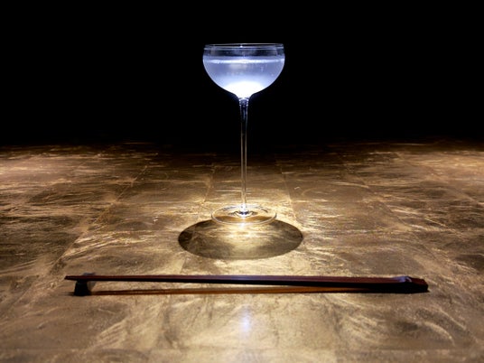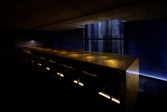 1階には、SAKEBAROの象徴ともいえるカウンターを今回は全面を純金箔仕上げで設けました。天井から降る小雨の打ちつける音と単音のピアノが静かに響く中、日本酒とお食事をお楽しみいただけます。
