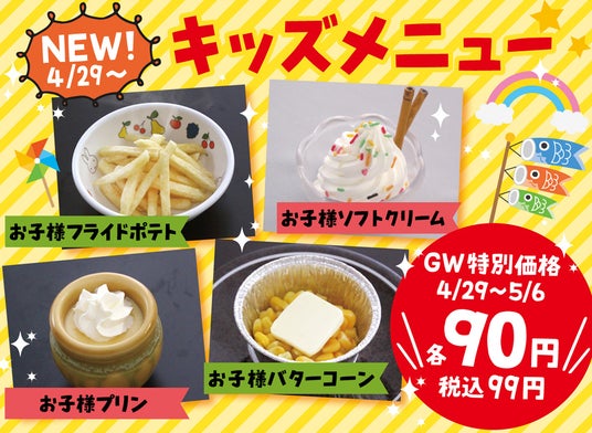 GWでのお子様連れのご利用シーンにあわせ、お子様向けの新メニュー4品を販売いたします。4/29~5/6GW期間中、GW特別価格でご提供いたします。