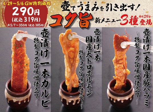 - 「壺漬け一本カルビ ~特製コク旨味噌仕立て~」GW特別価格290円(税込319円)※5/7~ 350円(税込385円)