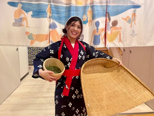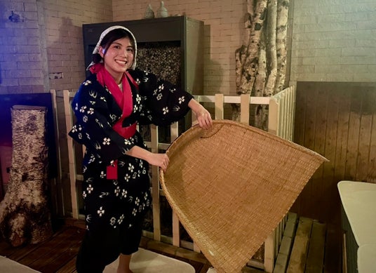 サウナ室では熱波師が茶娘の衣装を纏い、お茶の選別や運搬に使われる「箕(み)」をうちわ代わりに熱波をお届けします。狭山茶を使った「お茶ロウリュ」も提供します。