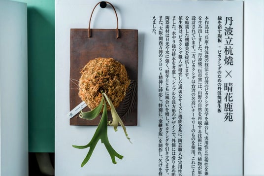 さらに台湾で人気のビカクシダの栽培を丹波焼で楽しむ提案として、「晴花鹿苑」王音筑氏の監修による「緑を宿す陶板 ― ビカクシダのための丹波焼植生板」も制作されました。日光や水に強い陶器素材に滑り止め彫刻を施し、実用性とデザイン性を兼ね備えています。展示には晴花鹿苑のビカクシダが用いられ、欠けを「金継ぎ」で修復したSDGs対応の特別仕様も展示しています。