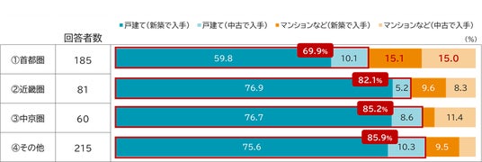 また、「分譲マンションの平均価格○○万円超え」など、メディアではマンション価格に注目が集まることが多いですが、住宅購入者の住居形態としては、「戸建て」の選択割合が首都圏で約7割、首都圏以外では8割以上と圧倒的な割合となっています【図表4】。