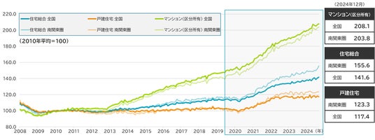 (出所)国土交通省「不動産価格指数」(2025年3月31日公表分)よりミライ研作成 *エリア表記は調査データに準ずる 南関東圏=東京都、神奈川県、埼玉県、千葉県