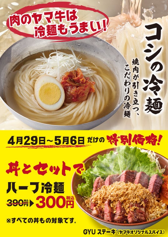 夏日続出!GWは焼きたて焼肉丼とさっぱり冷麺で!炭火仕上げの焼肉丼のうまさ引きたてるこだわりの冷麺がお得に楽しめる“GW感謝祭”開催丼とセットでハーフ冷麺が390円→特別価格300円に