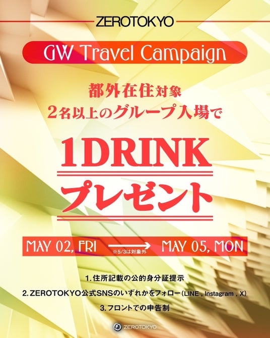 GW Travel Campaign!都外在住対象者で2名以上のグループ入場で1DRINK プレゼント!