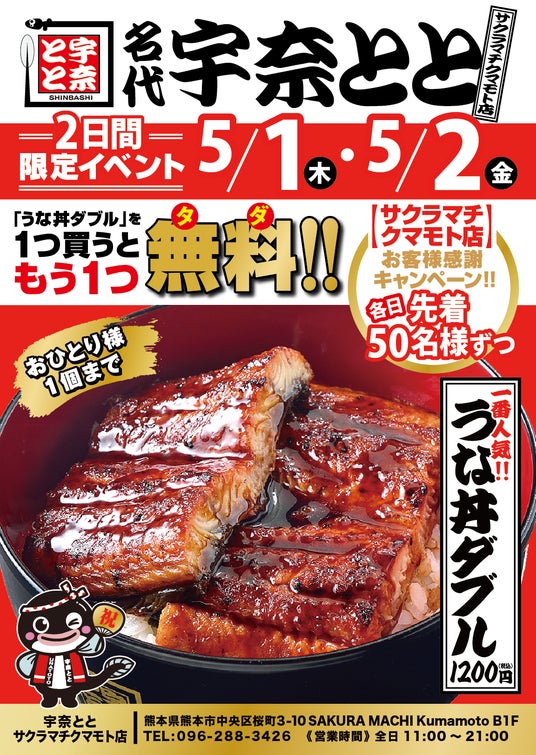 名代 宇奈ととサクラマチクマモト店が5月1日にリニューアル!「うな丼ダブル」を1つ買うと1つ無料に!