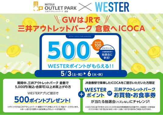 当日、三井アウトレットパーク 倉敷にて5,000円(税込・合算可)以上お買い上げ、かつWESTERアプリをご提示いただいた方にWESTERポイント500ポイントをプレゼントいたします。さらに、当日JR倉敷駅で降車したICOCAをご提示いただいた方限定で、WESTERポイントor三井アウトレットパークお買物・お食事券が当たる抽選会(ハズレなし)にチャレンジいただけます。