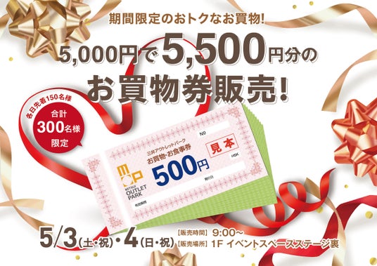 各日先着150名さま(合計300名さま)限定で、三井アウトレットパークお買物・お食事券販売会を開催いたします。販売会では、三井アウトレットパークお買物・お食事券5,500円分(500円分×11枚)を、5,000円で販売いたします。さらに、三井アウトレットパーク 倉敷公式Instagramアカウント(@mop_kurashiki)をフォローで各日先着150名さまにノベルティをプレゼントいたします。・開催期間:2025年5月3日(土・祝)~4日(日・祝)