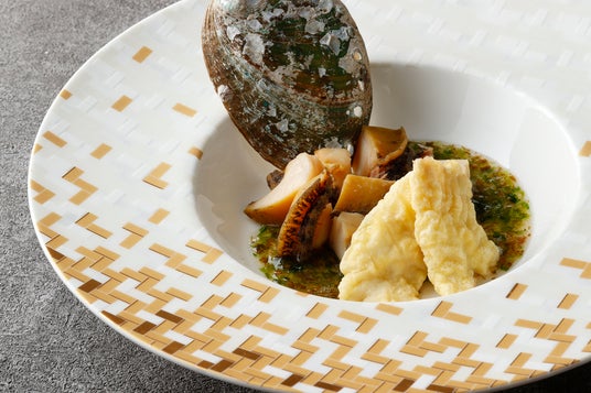豊前宇島漁港の「あかもく」を使った出汁香るアワビのグリルとハモの天ぷら(ディナー)