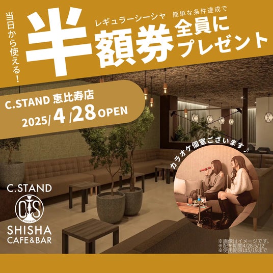 オープンを記念し、2025年4月28日(月)~5月12日(月)の期間中にご来店いただき、簡単な条件をクリアしていただいたお客様に、 《レギュラーシーシャ半額券》をプレゼントいたします。