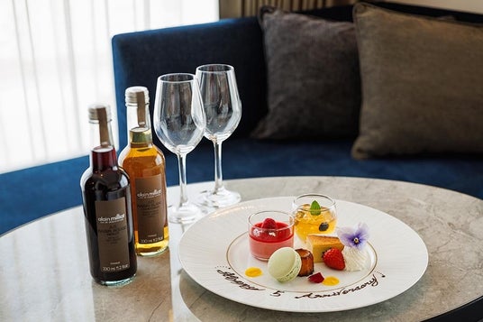 Terrace and Tableのパティシエによるスイーツプレートは「フランボワーズムース」「抹茶のマカロン」「カヌレ」「台湾カステラ」「シードルゼリー」の5種盛り合わせで華やかな見た目にこだわりました。フランボワーズやシードルのフルーティーな要素は、初夏にふさわしいさわやかな印象。また、抹茶や台湾カステラの東洋的な要素と、フランス発祥のマカロンやカヌレが調和。さらにスイーツと合わせてワイン用ぶどうで造られたプレミアムジュース「アラン・ミリア」もお付けします。