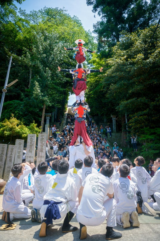 天高く人が連なる迫力の演舞・春の今治を彩る伝統芸能「継ぎ獅子」 5月の今治地方春祭りで披露!