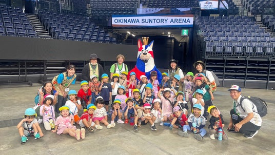 「おおきなわ」の活動の一環として「沖縄サントリーアリーナ見学・交流会」を実施し、4月25日(金)にホームタウンの沖縄市にある「山内保育所」の園児32名と職員が沖縄サントリーアリーナを訪れました。