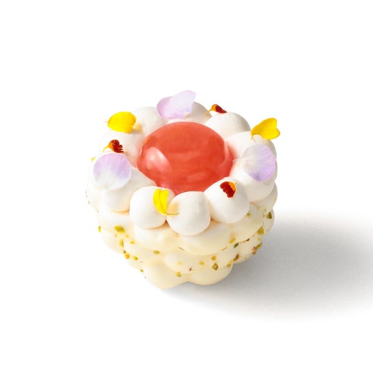 ピスタチオやオレンジコンフィ、アプリコットなどを加えたモンテリマールムースとグレープフルーツコンフィの層を、さっくりと焼き上げた繊細なメレンゲで包み込み、マスカルポーネシャンティとグレープフルーツのジュレで仕上げました。奥行きのある味わいと、食感と香りの調和をお楽しみいただけます。