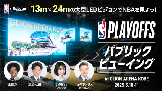 このたび、2025年5月10日(土)と11日(日)に、楽天グループ株式会社が運営する「NBA Rakuten」の主催により、 現在開催中の「NBA PLAYOFFS(※1)」のパブリックビューイングを開催します。GLION ARENA KOBEの国内アリーナ常設ビジョンとして最大級の壁面ビジョンで大迫力の映像と音響でお楽しみいただけます。