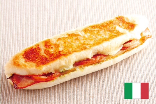 パンにバジルペーストを塗り、ベーコン・トマト・チーズと一緒にサンド。具材の旨味がぎゅっと詰まったバジル香るイタリアンテイストのパニーニ。