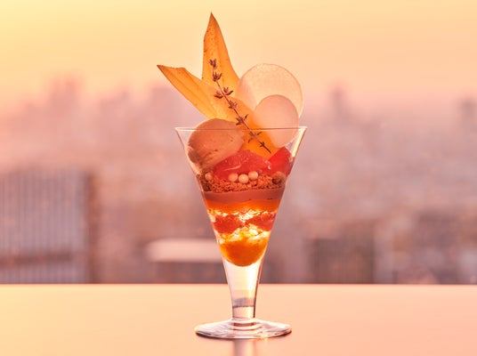 シトラスパフェ 2,400円夏らしく爽やかな酸味や甘みのある柑橘に、ベルガモット の香るアールグレイとショコラを合わせました。 オレンジのコンフィチュールや瑞々しいフレッシュのル ビーグレープフルーツ、甘味の強いマンダリンオレンジの ソルベを合わせ、仕上げには柚子香るチョコレートと飴細 工をあしらいました。 ディナーだけでなく、バータイムでもお楽しみいただけま す。
