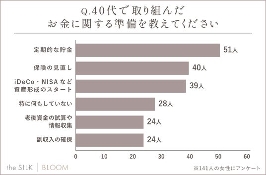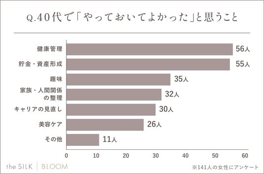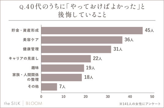 45歳以上の女性141人に、「40代でやっておいてよかったこと」を聞いたところ、以下のような結果となりました。