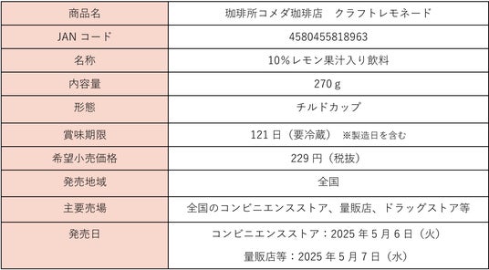 トーヨービバレッジ株式会社(本社:東京都渋谷区、代表取締役社長:熊谷聡)は、株式会社コメダ(本社:愛知県名古屋市、代表取締役社長:甘利祐一)と共同開発した「珈琲所コメダ珈琲店 クラフトレモネード」を2025年5月6日(火)より全国のコンビニエンスストア、5月7日(水)より量販店等にて順次発売致します(一部地域・一部店舗を除く)。