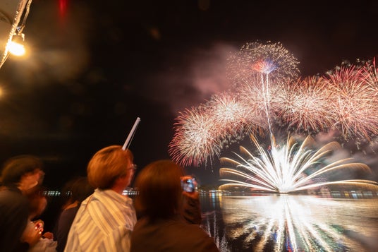 湖上からバルーンランタンと花火を眺めて、幻想的な光景を楽しむことができる約50分間の夜航。