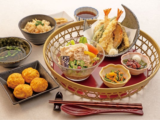 名物玉子焼と季節限定の「豚菜ごまだれ涼麺」に季節の天ぷら、季節の炊き込みご飯が付いた、この季節ならではの御膳。一口サイズのプチ甘味がついた、「玉子焼・お出汁ひまわり」の人気メニューをお楽しみください。